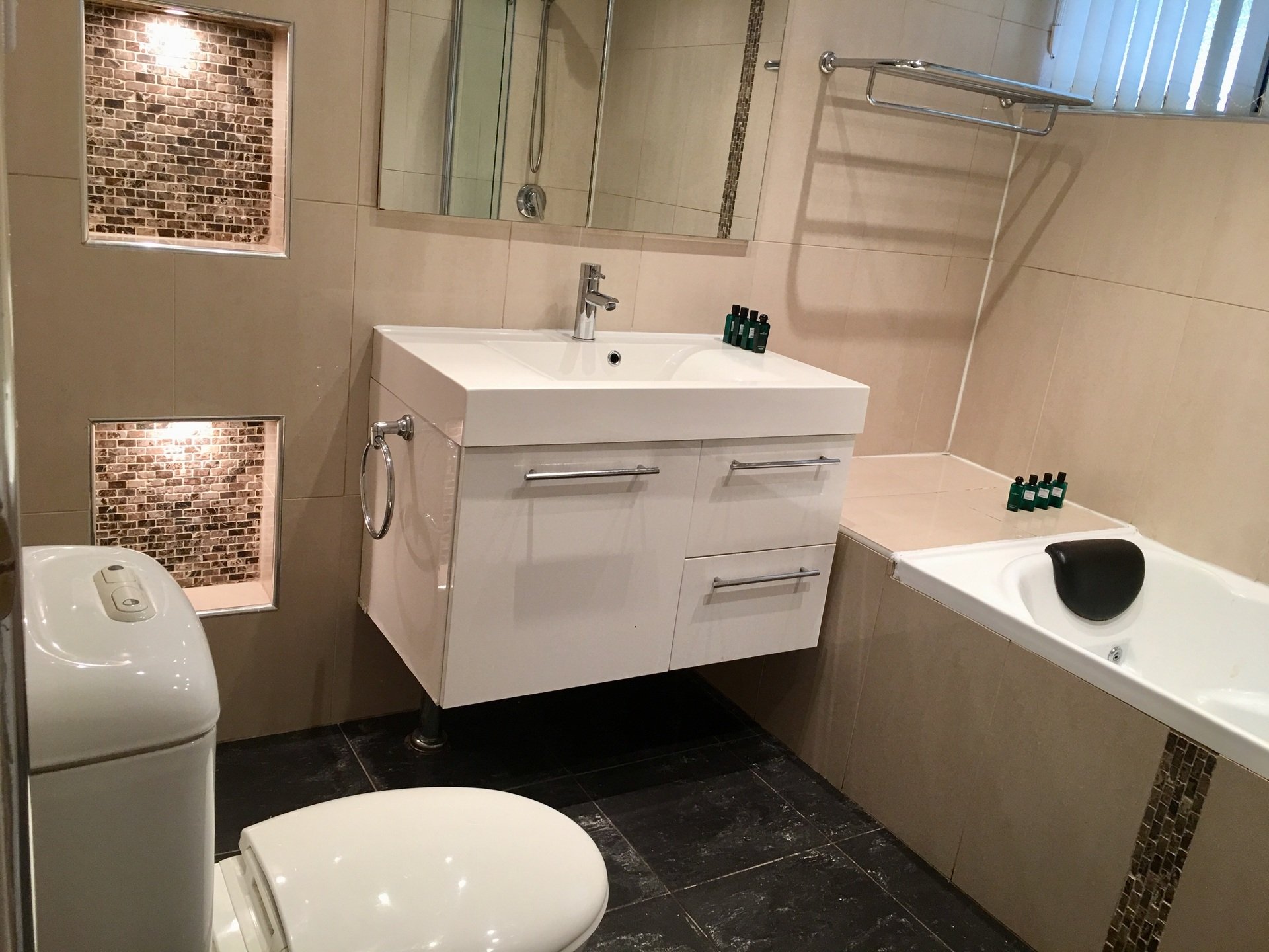 * Renovated bathroom with shower over bath and feature wall