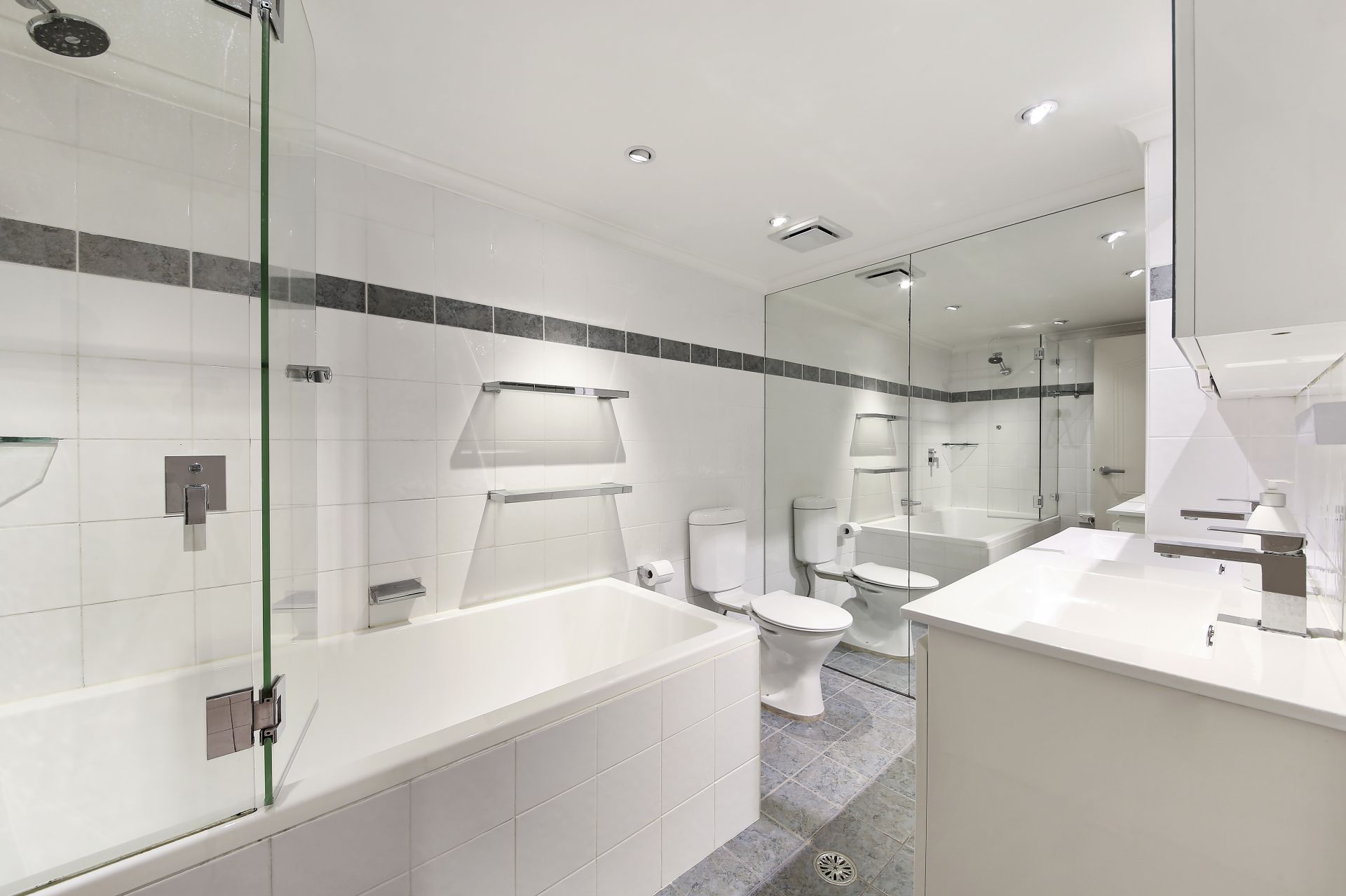 * Sparkling bathroom, with combined bath & shower and double vanity