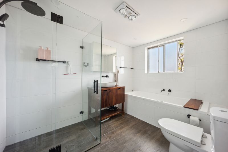 * Sleek modern bathroom with shower & separate spa