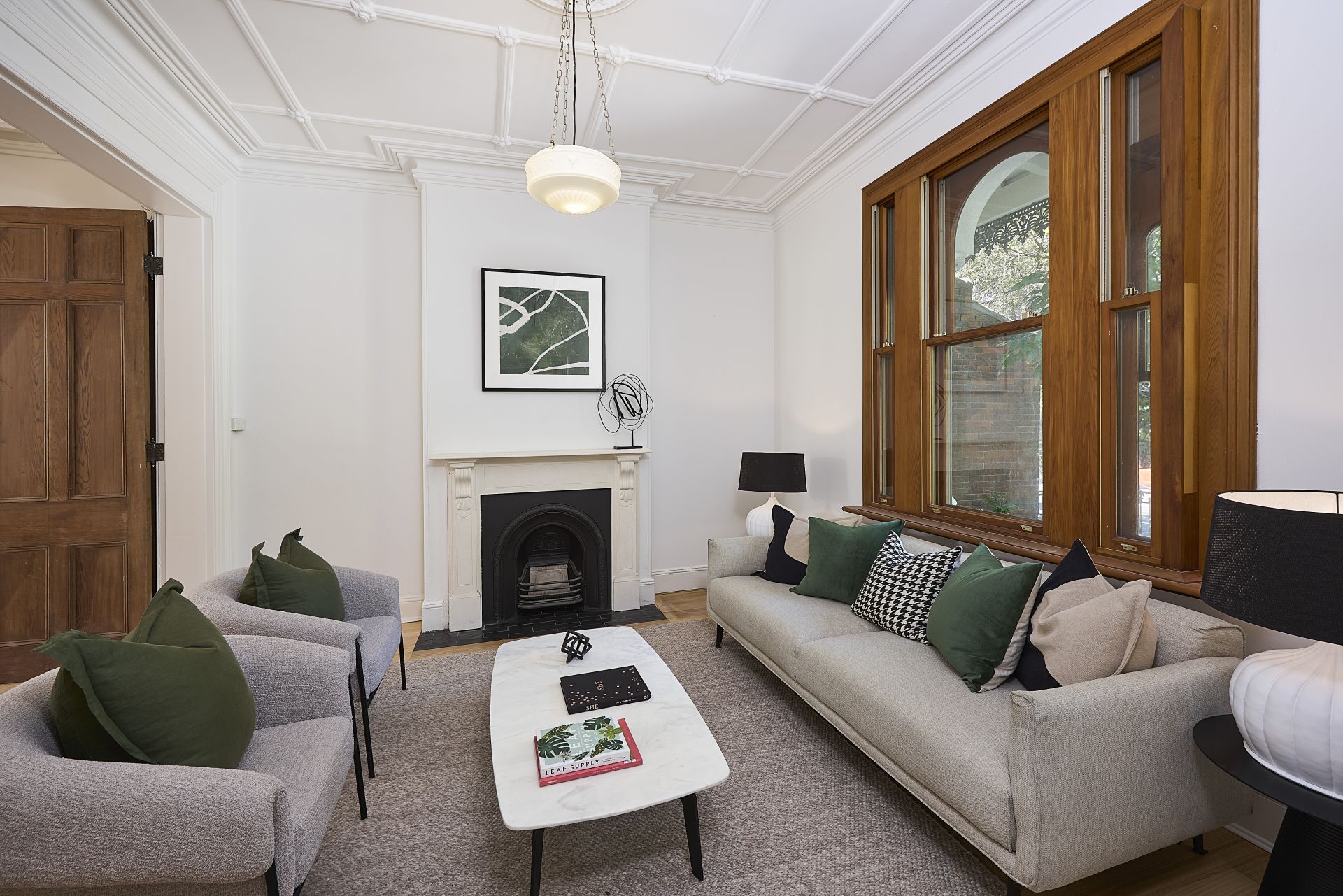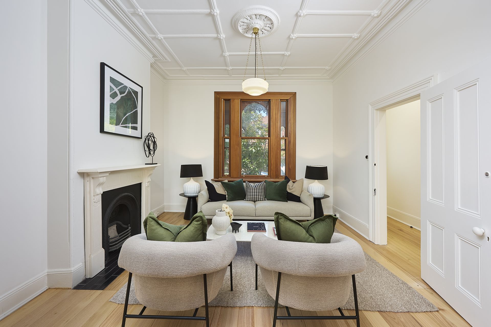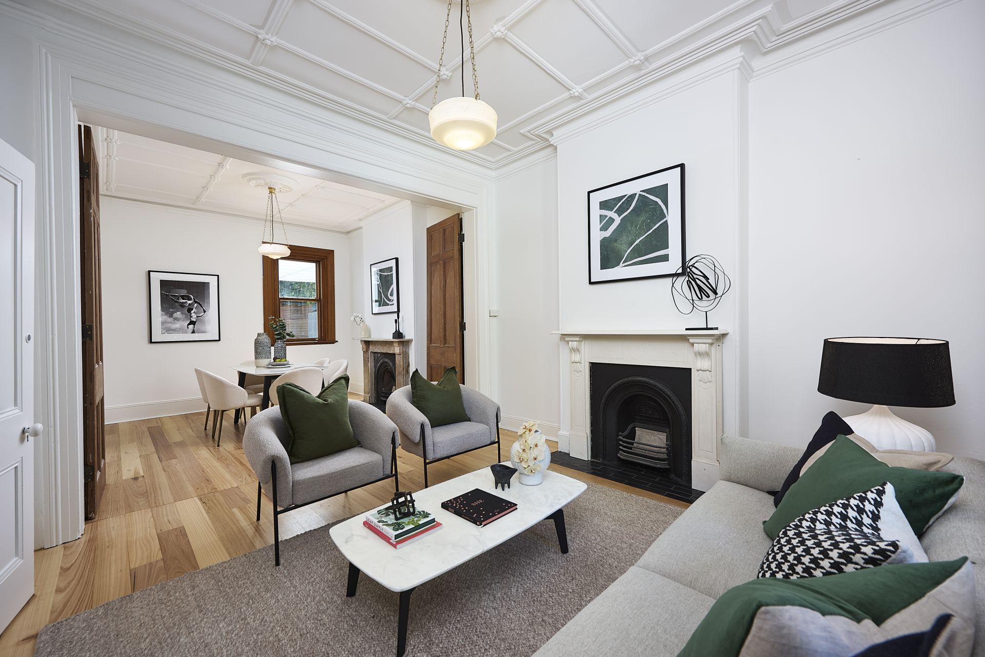 Elegant double living and dining room divided by its exposed original bi-fold doors, complete with fireplaces